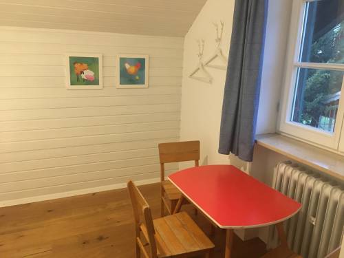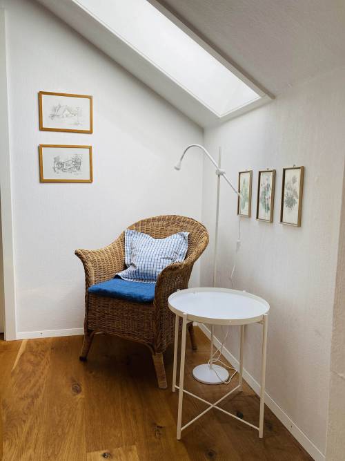Unsere kleinste Wohnung mit ca. 55qm geht direkt vom Garten weg und hat einen eigenen Sitzplatz neben der Tür. Im Erdgeschoss befindet sich eine kleine, gemütliche Wohnküche. Über die wohnungsinterne Treppe gelangt man zum Bad, einem großen Elternschlafzimmer, und davon abgehend zu einem kleinen Kinderzimmer.